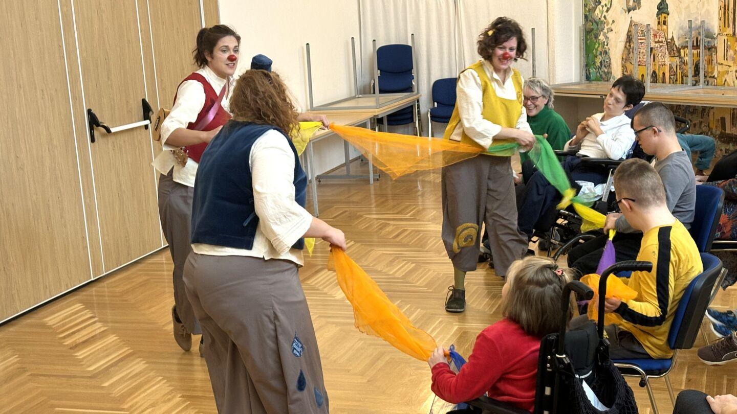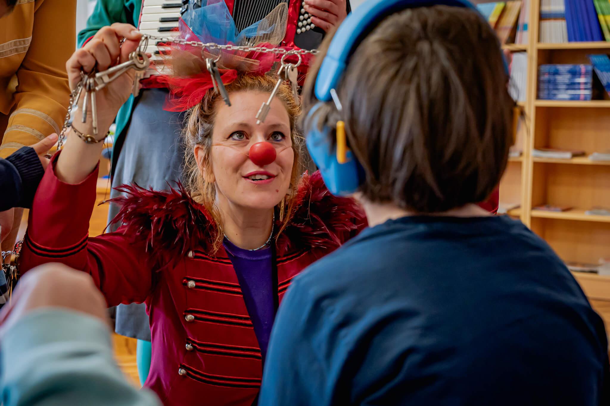 Klaunovi u CRVENIM NOSOVIMA profesionalni su umjetnici koji se u svom radu oslanjaju na kontinuiranu edukaciju, iskustvo i visoku razinu osjetljivosti prema djeci s teškoćama. Njihova je uloga pratiti dijete, prepoznati njegove signale i graditi odnos korak po korak, kako bi dijete u izvedbi imalo osjećaj sigurnosti i slobodu da sudjeluje na svoj način.