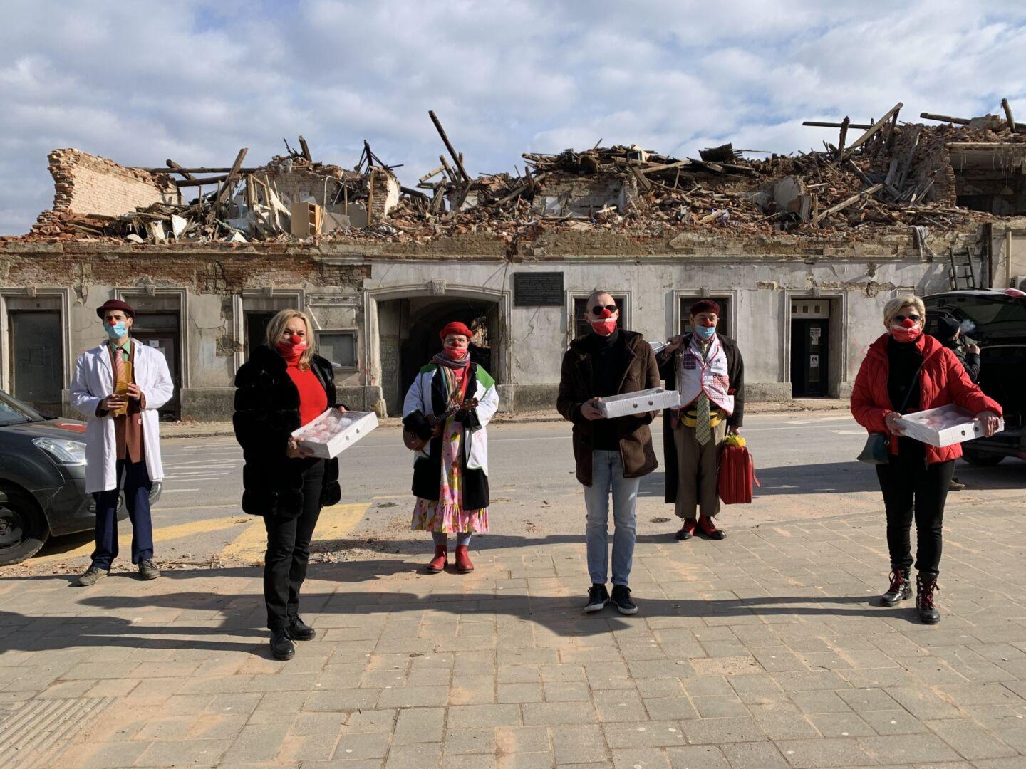 Zatim smo se zaputili u centar Petrinje, gdje smo na trgu Josipa Jurja Strossmayera prolaznike obradovali krafnama ali i klaundoktorskim trikovima pobrinuvši se da nitko ne ode bez osnaženog osmijeha. Posebno lijep trenutak bio je onaj proveden u pjesmi, kad su se začule stare petrinjske pjesme koje su s klaundoktorima zapjevali građani starije životne dobi.