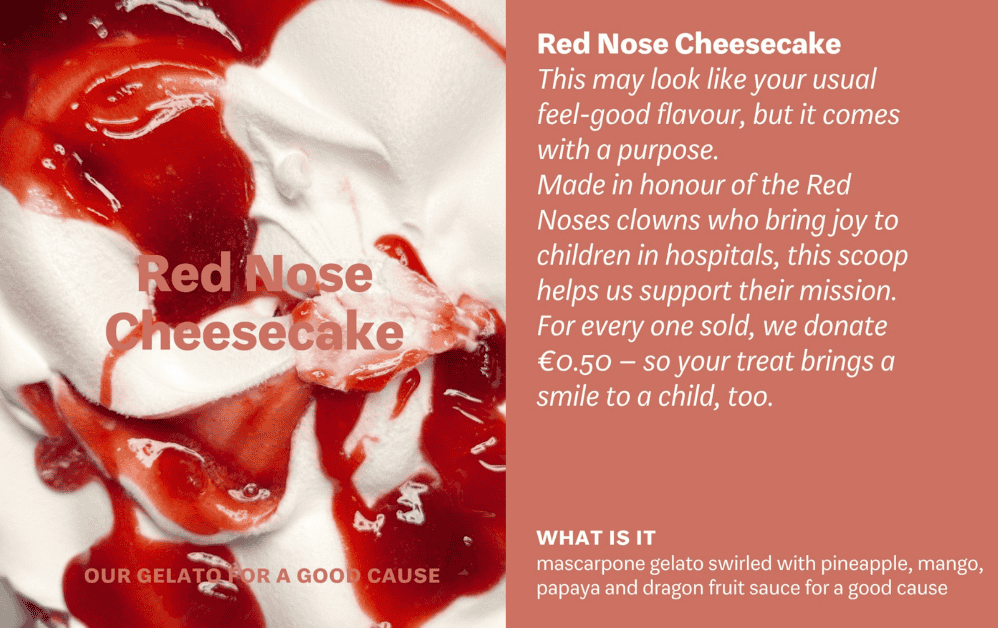 Peppino’s Gelato, lokalna slastičarnica poznata po ručno rađenim sladoledima, pažljivo biranim sastojcima i poštovanju tradicije, odlučila je dio svoje ljetne ponude pretvoriti u humanitarnu priču. Kroz poseban okus Red Nose Cheesecake, Peppino’s je za svaki prodani sladoled donirao 50 centi CRVENIM NOSOVIMA, omogućujući da naši klaunovi i dalje donose osmijehe djeci u bolnicama, starijima u domovima, ali i odraslima na onkologiji te svima koji prolaze kroz krizne životne situacije.